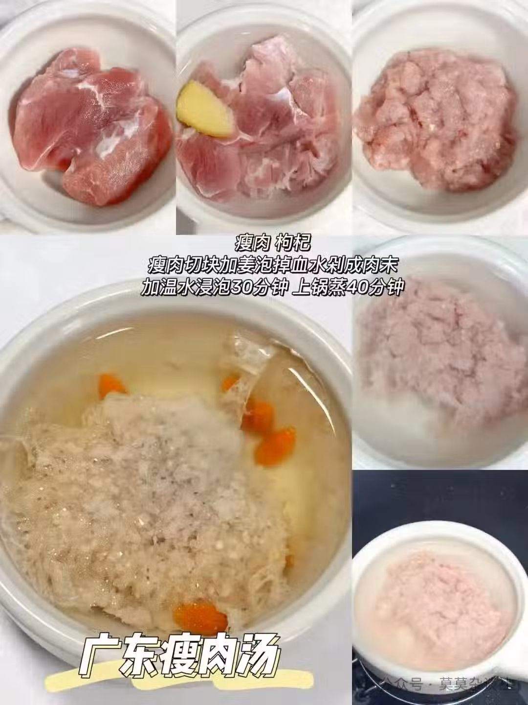 剁成肉末後放入湯碗,加水蒸煮40分鐘。