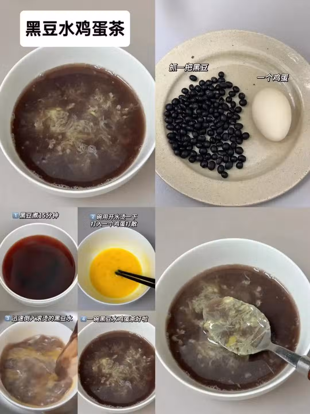 迅速倒入滾燙的黑豆水沖成雞蛋花,加少量糖或者蜂蜜調味即可。