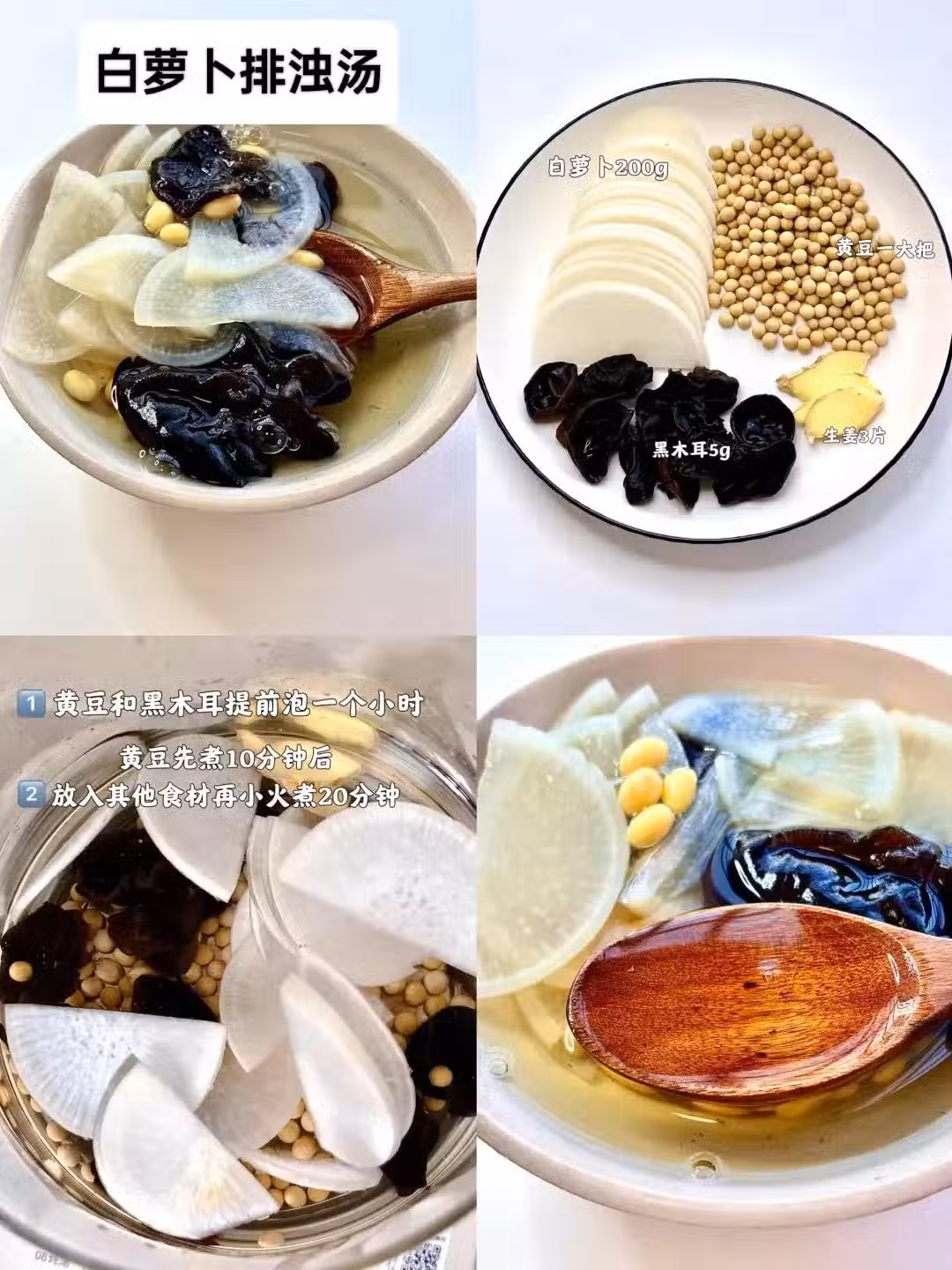 黑木耳提前泡發,白蘿蔔帶皮洗凈切塊;先把黃豆煮20分鐘後再放白蘿蔔、黑木耳和薑片,一起再煮20分鐘,淡淡的味道,什麼都不用放,連著喝三天,喝完人很舒服~