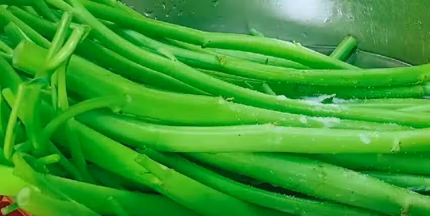1. 首先把空心菜杆切下來,把菜杆放入盆中,加入一勺食鹽,先用淡鹽水把菜杆給它浸泡一下,我們用手給它用力的捏一捏,把空心菜杆給它儘量的壓平壓實一點,這樣一會兒空心菜能夠更好的入味;