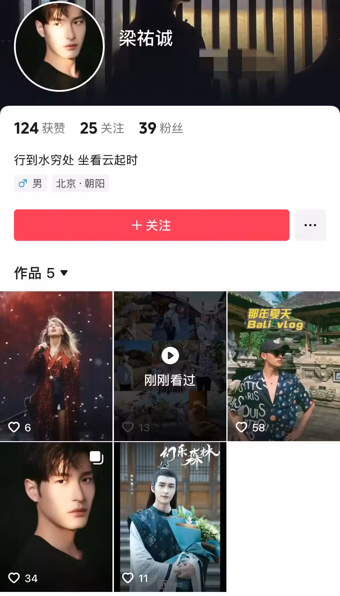 翻看梁祐誠的視頻帳號不難發現,他只有39個粉絲,內容也不過才5篇,但每一次的曬照都顯得那麼帥氣和自然,尤其是面容,更像是年輕時候的黃曉明,古裝扮相更透著英姿,以這樣的方式結束,真的讓人倍感惋惜。