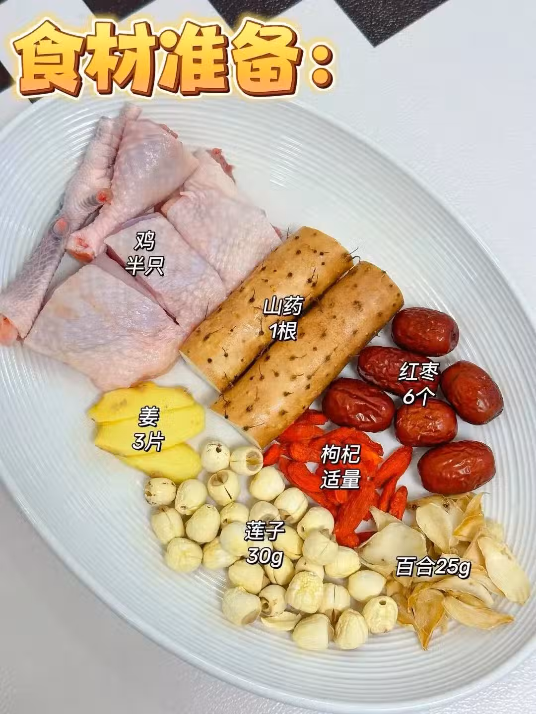 1️⃣雞切塊,焯水洗凈浮沫;山藥削皮切段;紅棗去核,蓮子百合洗凈浸泡20分鐘。