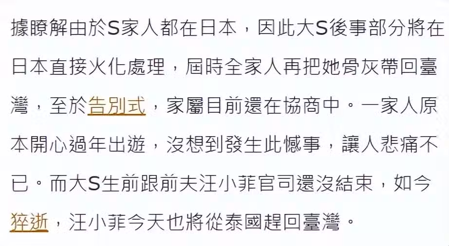 不過也有報道指,因為大S遺體在日本,所以汪小菲應該去日本參加火化儀式。