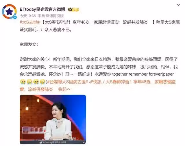 據浙江網友爆料,他的朋友接的大S一家的團,大S並不是今天,而是昨天早晨就走了。