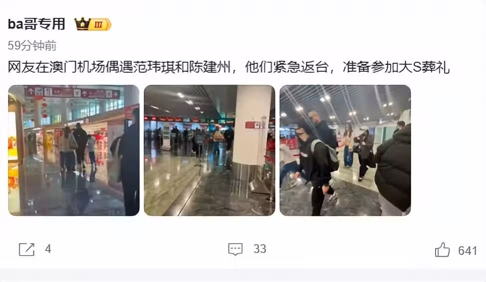 有媒體拍到范瑋琪和陳建州從澳門回台灣,疑似準備參加大S喪禮。----------------------------------------------------------------