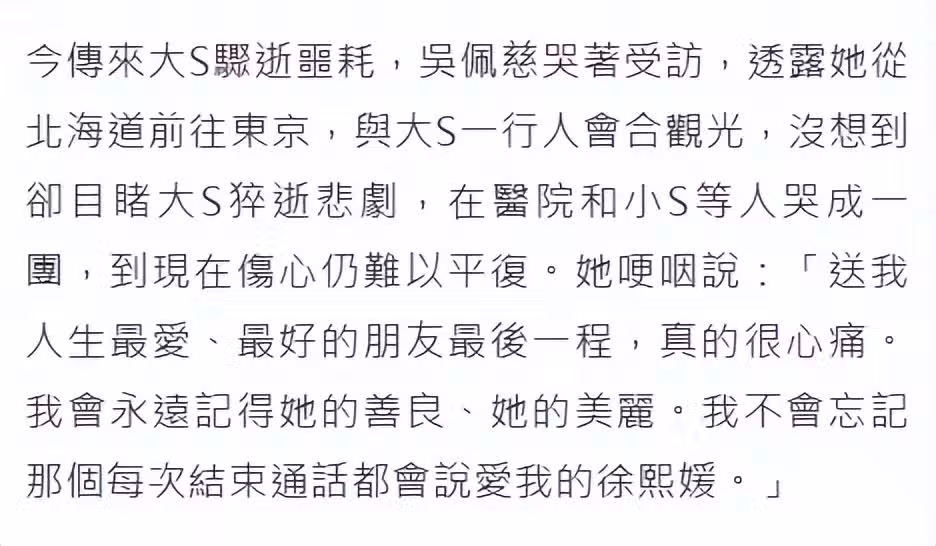 大S、小S全家都參與了此次旅行,閨蜜吳佩慈也是同伴之一,她親歷了大S從患病、送醫到不治身亡的全過程,在病房與小S抱頭痛哭,吳佩慈在2月3日接受採訪,傷心哽咽道「送我人生最愛、最好的朋友最後一程,真的很心痛。我會永遠記得她的善良、她的美麗。我不會忘記那個每次結束通話都會說愛我的徐熙媛。」