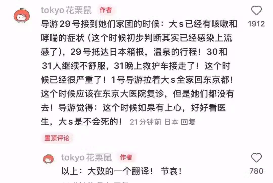 大S屬於是全程帶著病和家人吃吃喝喝玩玩,中間還被診斷為甲流,但家人完全沒重視,還帶著她走接下來的行程,以及泡溫泉。