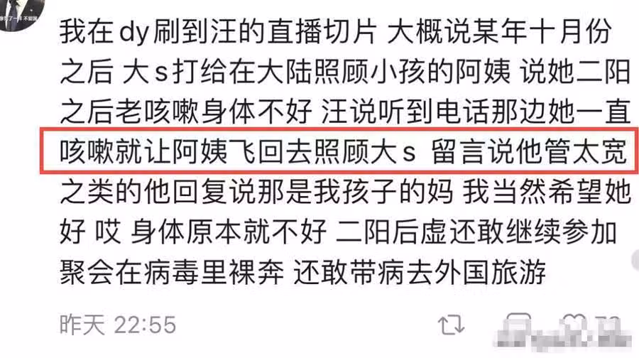 這一點的細節從汪小菲之前直播的行為就可以看出來。當時大S感染病毒,便打電話給身在大陸照顧小孩的保姆,汪小菲聽聞後,立刻讓保姆前往照顧。