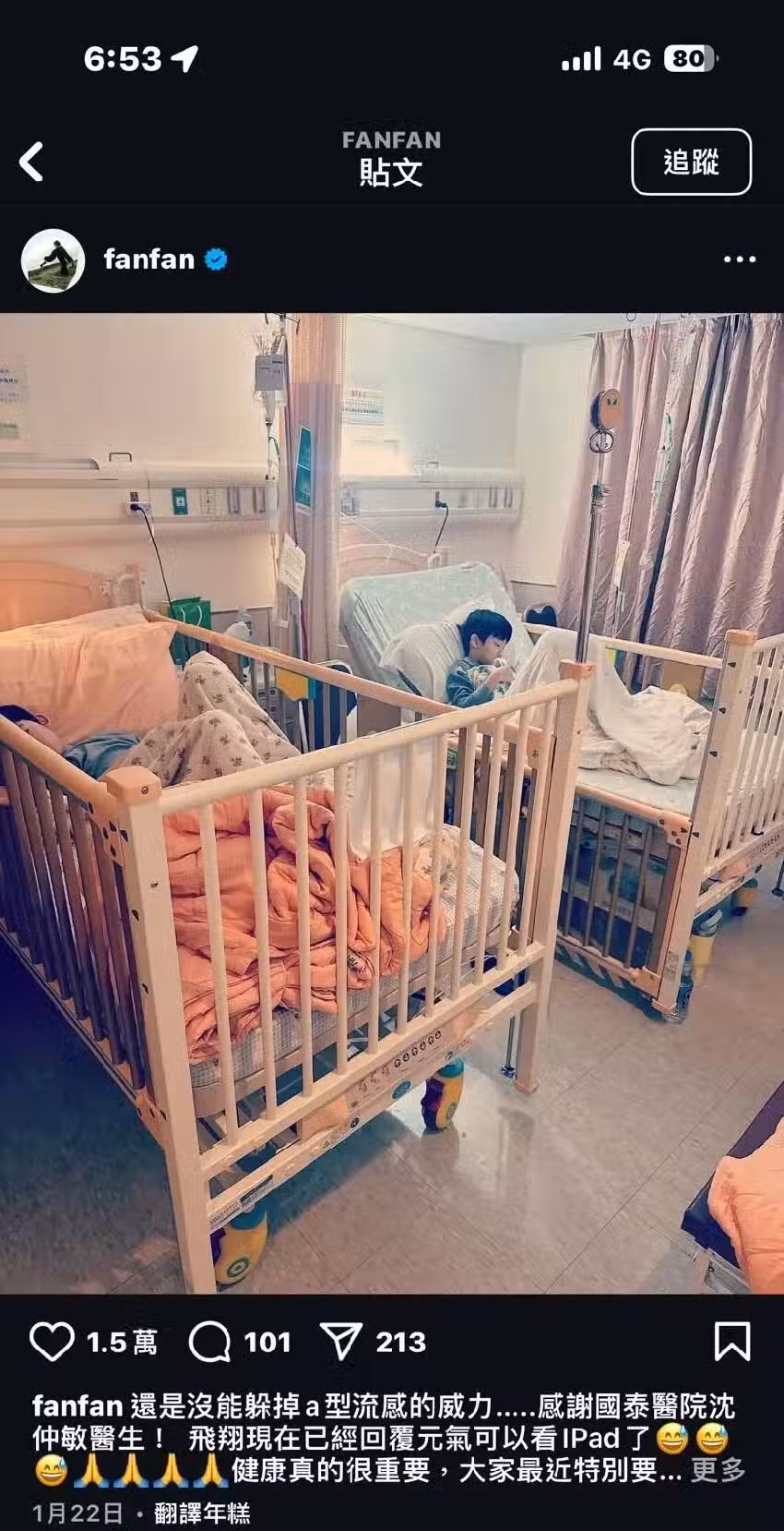 原PO在PTT引述了Threads上的某則貼文,有一名網友還原時間軸,指出上月22日,藝人范瑋琪在IG貼出雙胞胎兒子得A流住院的照片,「全家都病懨懨的」。