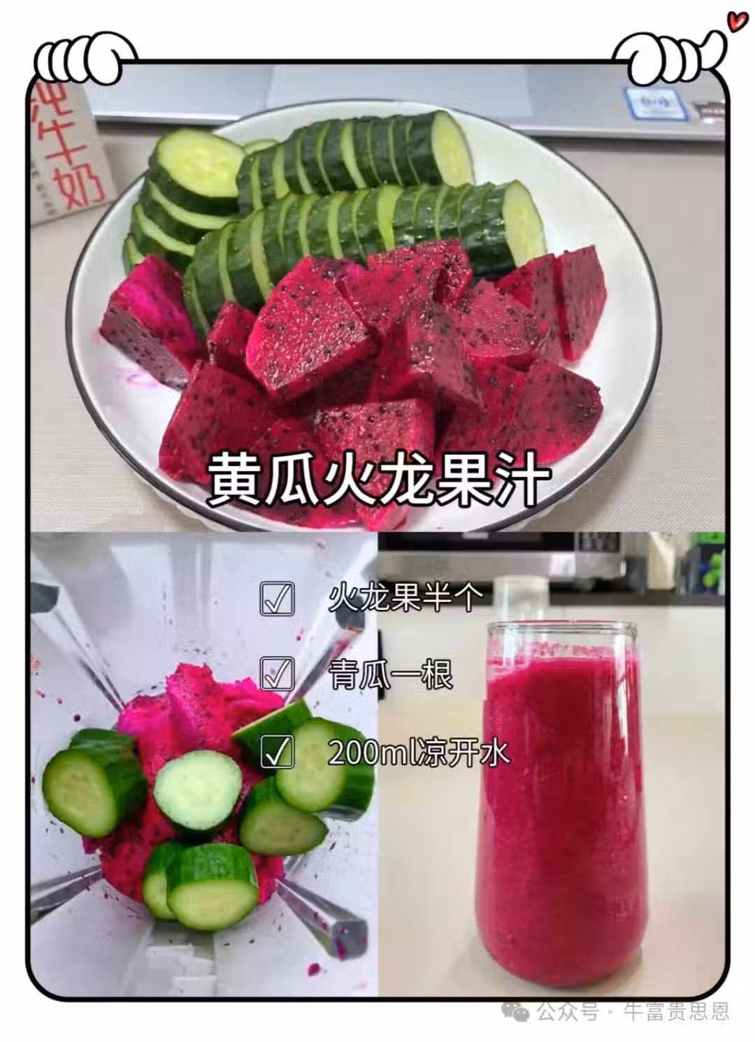 「黃瓜火龍果汁」是一款清新爽口的果蔬汁飲品。火龍果鮮艷的色澤賦予果汁迷人的玫紅色,而黃瓜則帶來了清爽的口感與淡淡的清香。二者搭配,不僅顏值頗高,還富含多種維生素與膳食纖維,是一款健康又美味的飲品。
