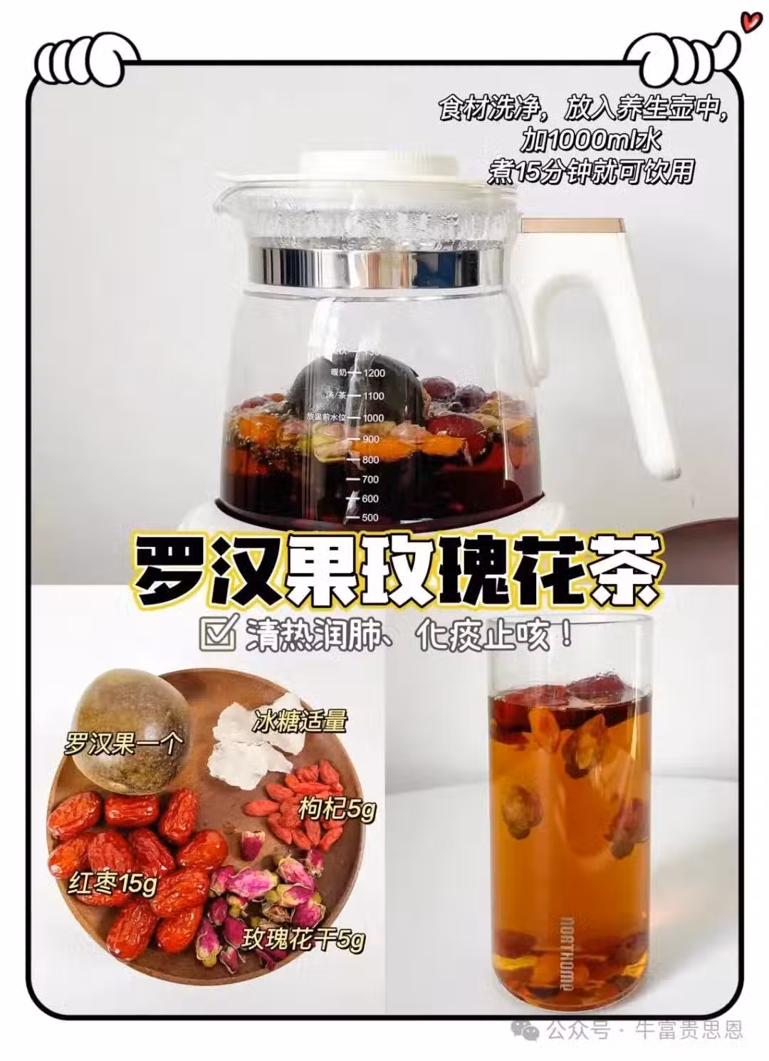 羅漢果一個、紅棗15克、玫瑰花干5克、枸杞5克、冰糖適量