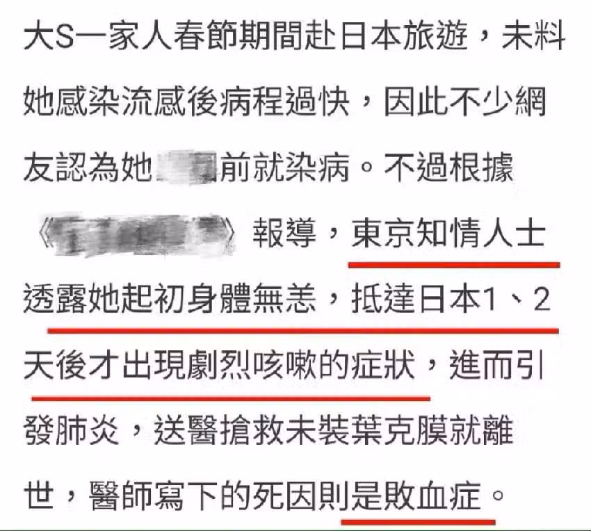 據媒體報道得知,東京那邊的知情人士透露,大S起初身體並無大礙,抵達日本1、2天後才出現劇烈咳嗽的症狀,進而引發肺炎,送醫院搶救未安裝葉克膜就離世了,醫生寫下的死因是敗血症。