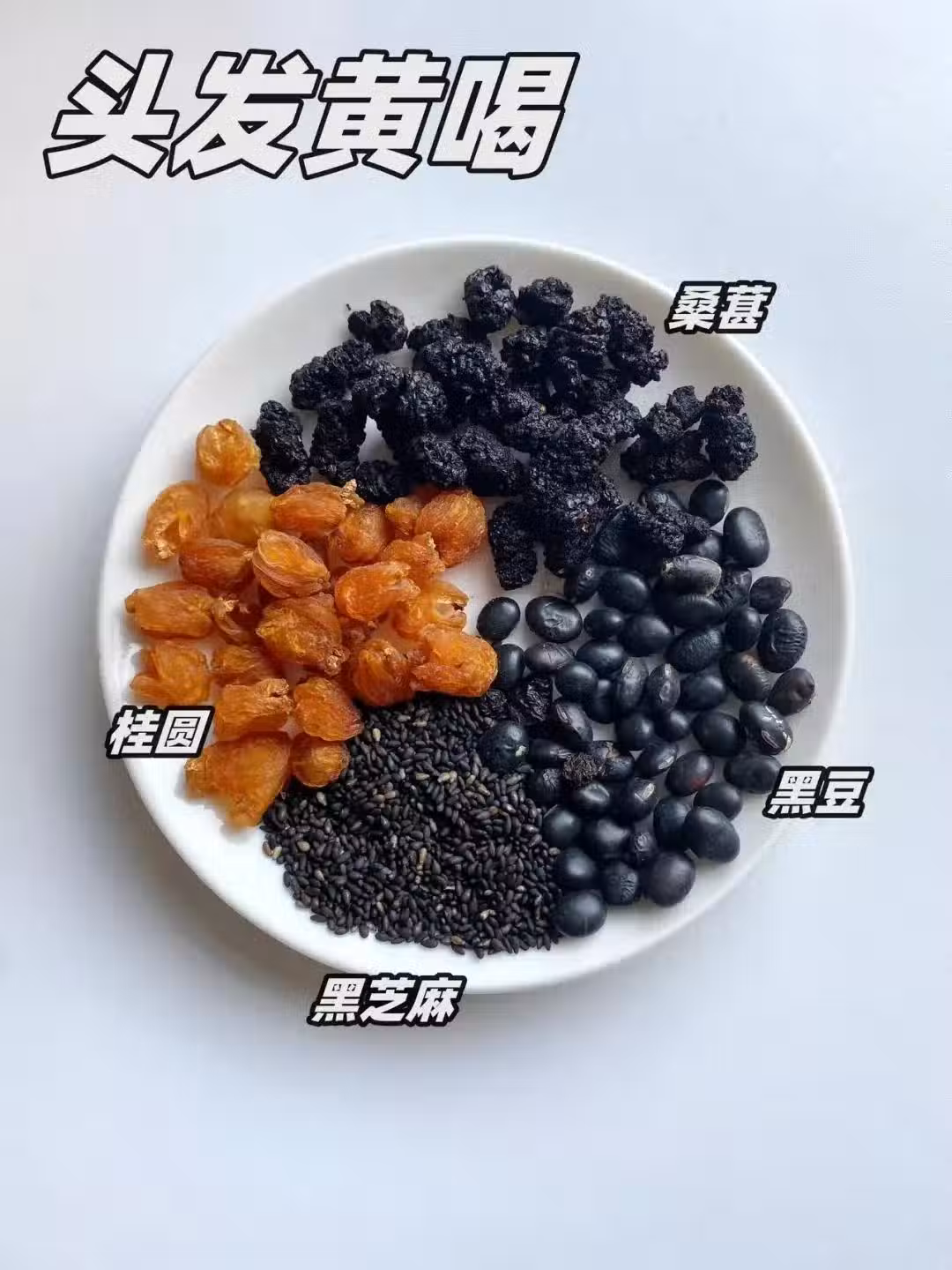 由黑豆、黑芝麻、桂圓、桑葚組成的飲品,能夠改善頭髮黃的狀況,使頭髮變得更加柔順光滑、烏黑髮亮。但請注意,飲食調理需要持之以恆,並且每個人的體質和頭髮狀況都不同,因此效果可能因人而異。