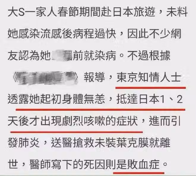 據媒體報道得知,東京那邊的知情人士透露,大S起初身體並無大礙,抵達日本1、2天後才出現劇烈咳嗽的症狀,進而引發肺炎,送醫院搶救未安裝葉克膜就離世了,醫生寫下的死因是敗血症。