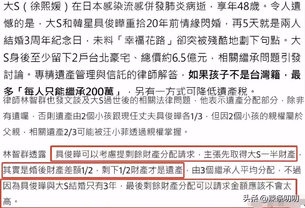 遺產分成三份,具俊曄一份,兩個孩子各一份。當然這只是律師表示理想狀態下的情況,在這種情況之下,由於汪小菲是兩個孩子的父親,所以大s將有2/3的財產會回歸到他的名下。