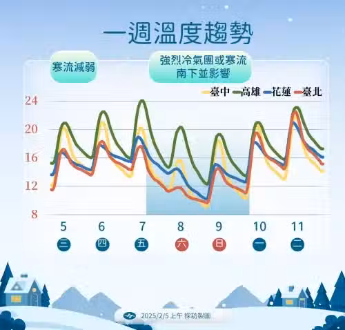 至於回暖時間點,吳德榮說,下周一白天至下周三各地晴朗穩定,逐日回暖,日夜溫差很大,下周四下一波鋒面通過,冷空氣南下轉雨降溫,天氣又會再轉變,但冷空氣不強,到時候的天氣還是要依照觀察模式調整。