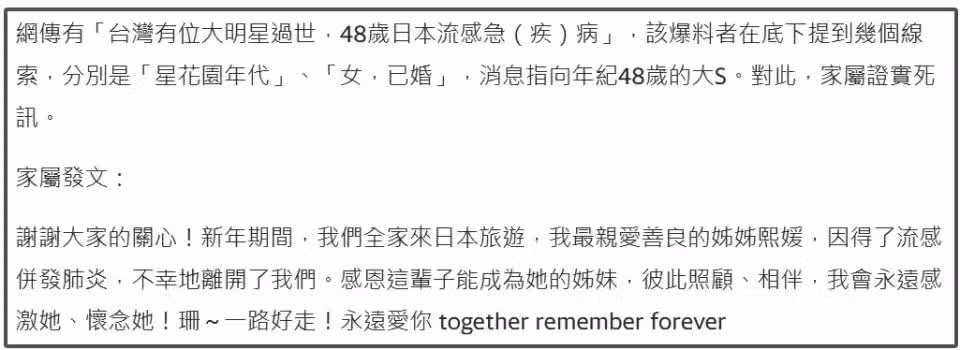 畢竟兩人才結婚3年,大S身體一直不好,需要好好照顧,連門都很少出,這次去日本旅行,大機率也是希望陪伴家人,結果突發噩耗。有韓媒試圖聯繫具俊曄,但是具俊曄方面選擇了跟外界斷聯,似乎還沒有調整過來。