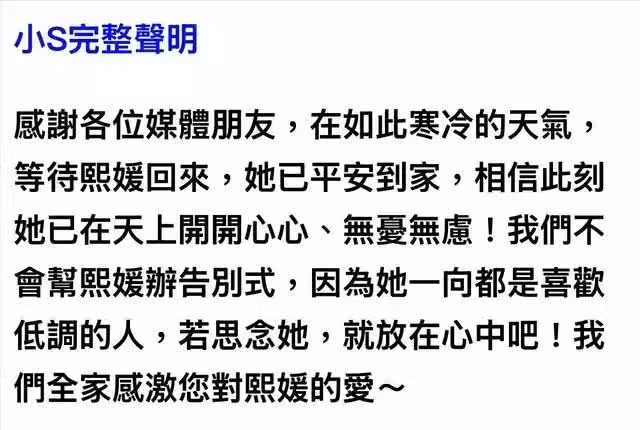 大S一家於今天下午三點乘坐包機到達台北,落地不久小S通過經紀人發聲,稱大S已平安到家,不會舉辦告別式。