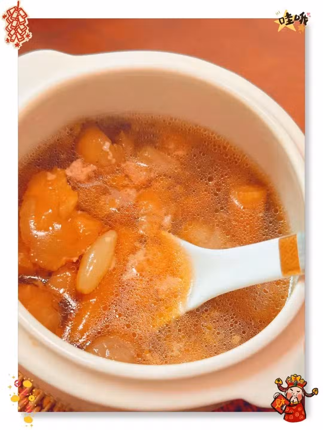 紅參補氣養血,魚膠富含膠原蛋白,二者搭配上黨參、黃芪、桂圓、麥冬等食材,慢火燉煮出的湯汁濃郁滋補。
