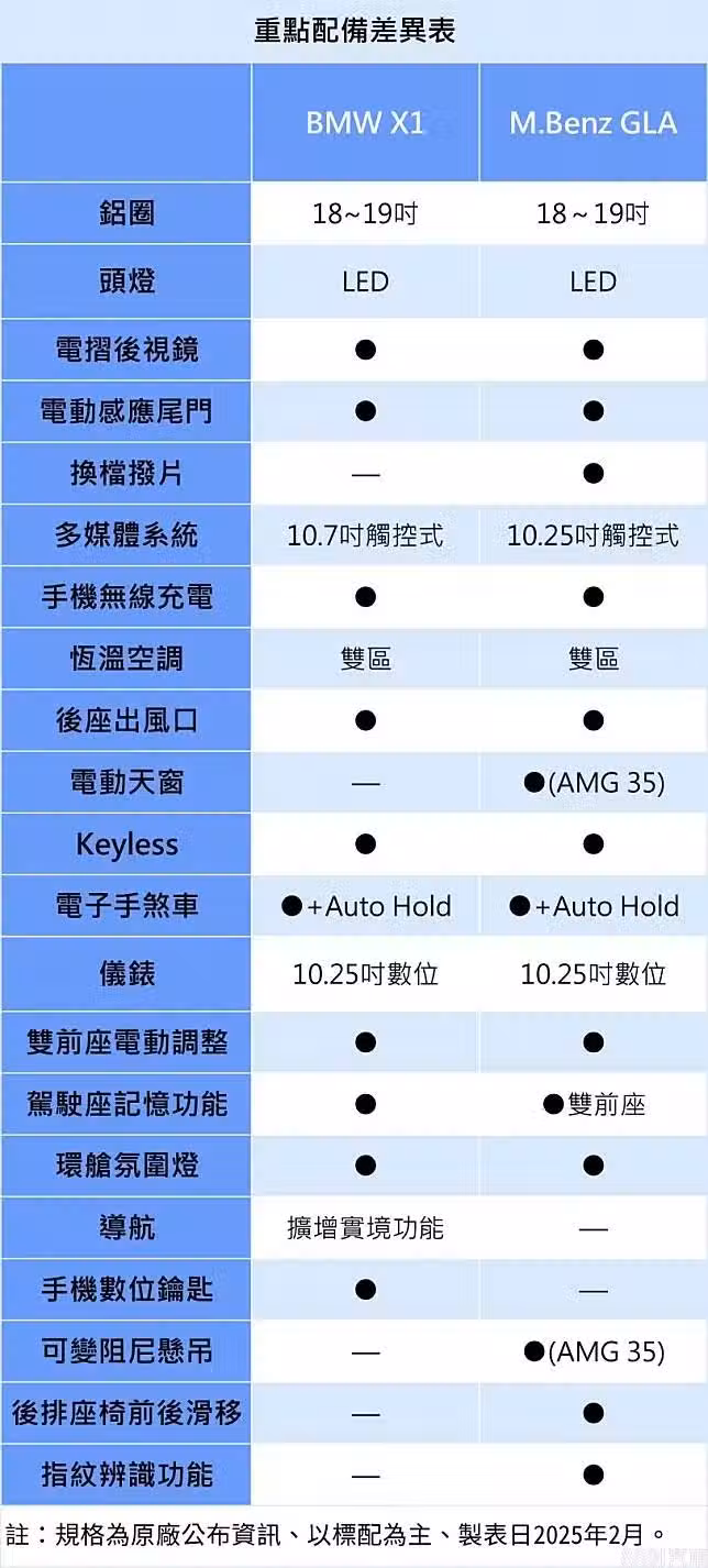 重點配備差異上,電動尾門、大螢幕、電動調整座椅、無線充電等,現在大家比較在意的實用配備兩車都很齊,重點差異在於X1多出AR擴增實境導航、手機數位鑰匙功能,科技感會略好一些。至於GLA個人覺得比較有感的獨占配備是座椅記憶功能,以及后座前後滑移,同時多出換檔撥片增加駕駛樂趣,都算是會頻繁使用的功能,因此在內裝配備豐富度上我會投GLA一票。
