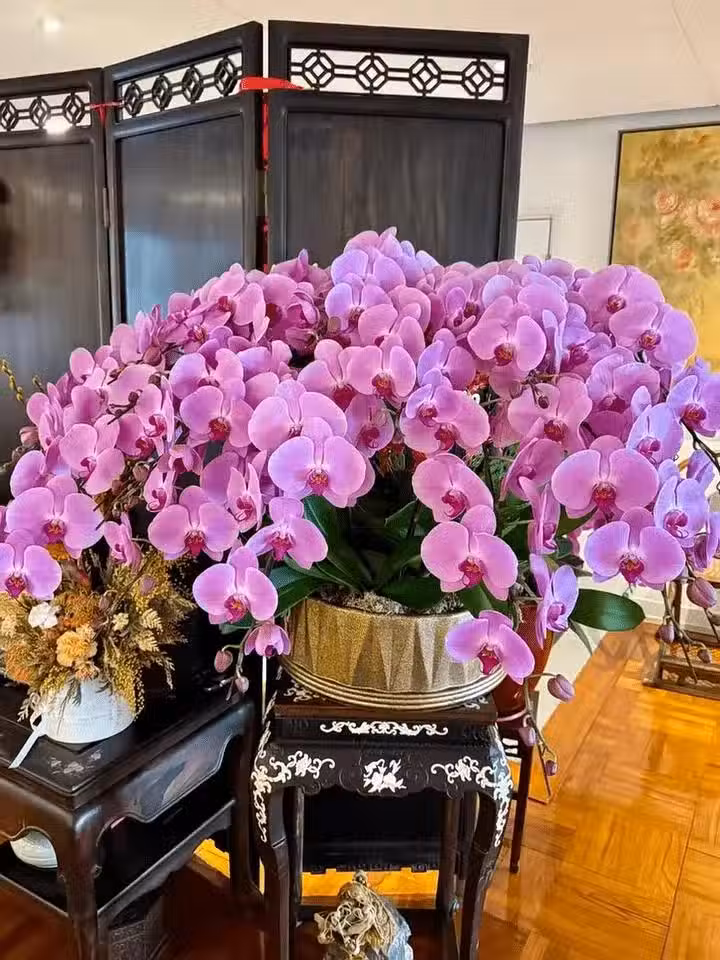 四周更擺放了不少古董及高級擺設,並以各種蘭花及朱頂紅圍繞著,而闊落的露台擺放了兩盆蘭花、一棵牡丹花,還有其他種類的植物,顯得優雅又有格調。