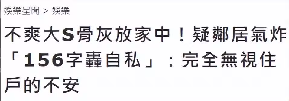 據台媒2月7日爆料,疑似大S鄰居在社交平台發文,質問小S為什麼那麼自私,把親人骨灰放在家中,既然那麼愛姐姐,每天必須和她聊天,為什麼不放到你的「帝寶」自家,鄰居認為想得到別人尊重就要尊重別人,逝者已逝讓大S安息,陽宅陰宅都分不清楚,如果是透天別墅,放幾十個都沒人管,請不要讓大樓住戶要為了你們的自私行為,而沒了生活品質。