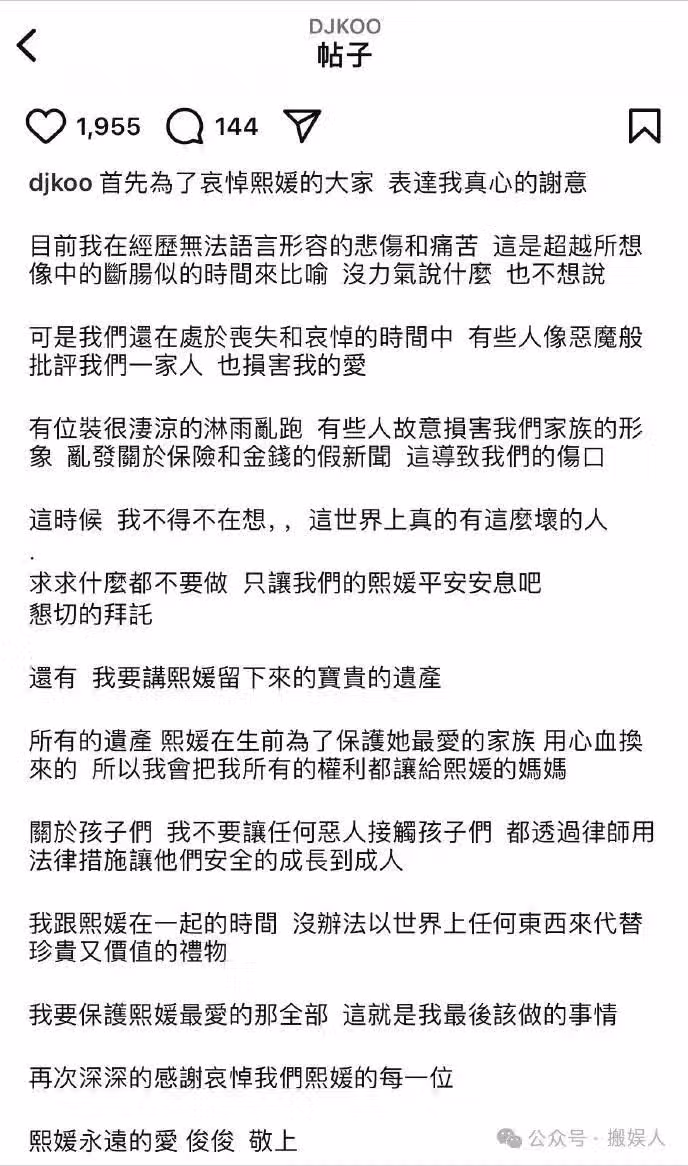 他著重交代兩件關鍵事情:一是宣布放棄大 S 的遺產,將其全部留給 S 媽,以實際行動表明自己並非覬覦錢財之人;二是明確表示,雖身為繼父,但會依照妻子遺願,通過法律手段保護孩子直至成年,堅決不讓 「惡人」 接觸孩子,這無疑是在宣告他要爭奪孩子撫養權,阻止汪小菲帶孩子回北京撫養。