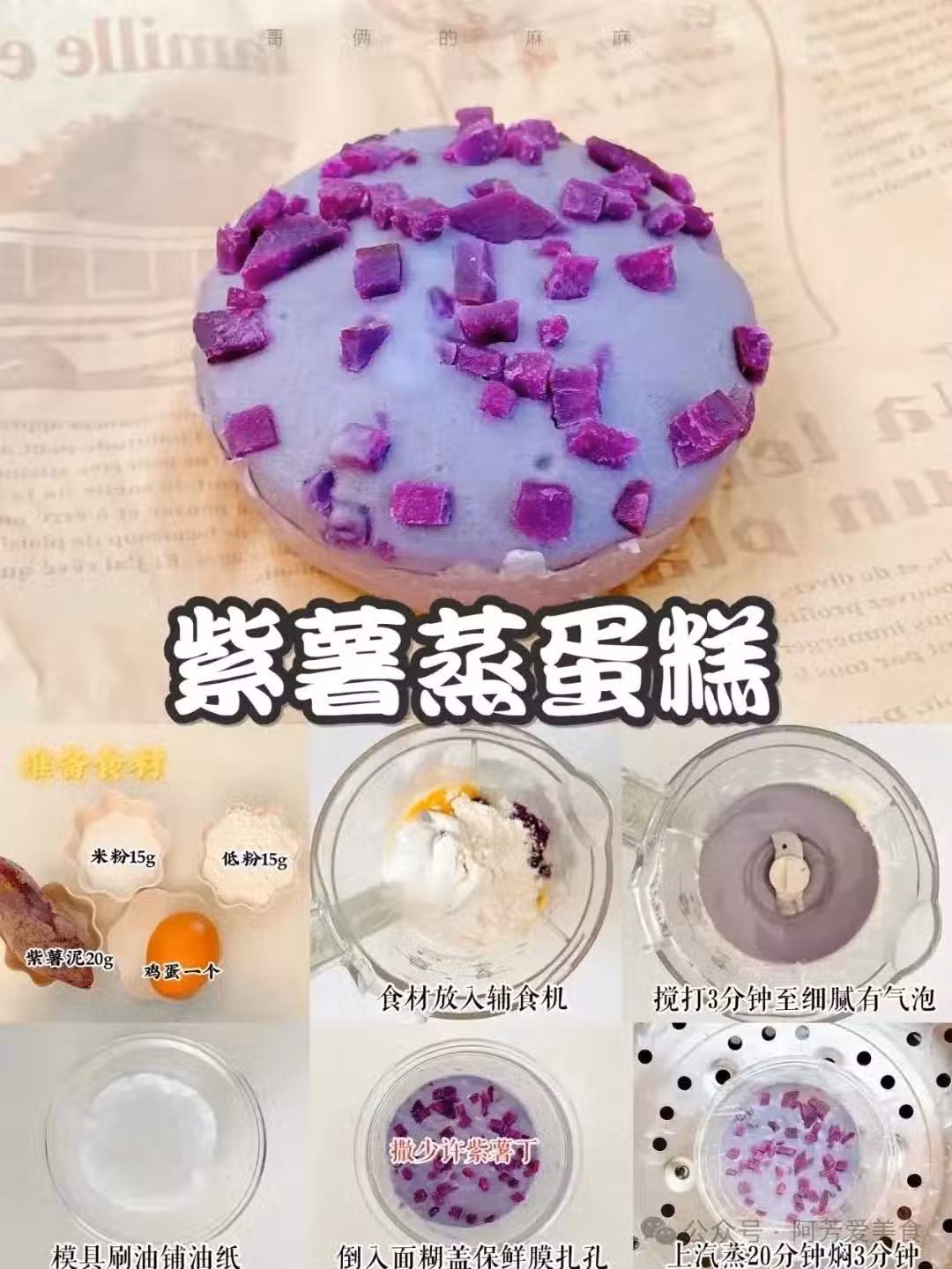 紫薯蒸蛋糕,紫薯的,濃稠香甜的口感再打成泥後會更加的濃郁,在做成蛋糕後非常的軟糯,又帶著一絲甜甜的口感。