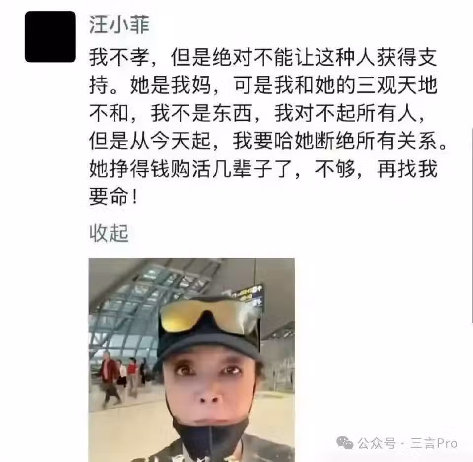 汪小菲在朋友圈發文:我不孝,但是絕對不能讓這種人獲得支持。她是我媽,可是我和她的三觀天地不和,我不是東西,我對不起所有人,但是從今天起,我要和她斷絕所有關係。她掙得錢購活幾輩子了,不夠,再找我要命!