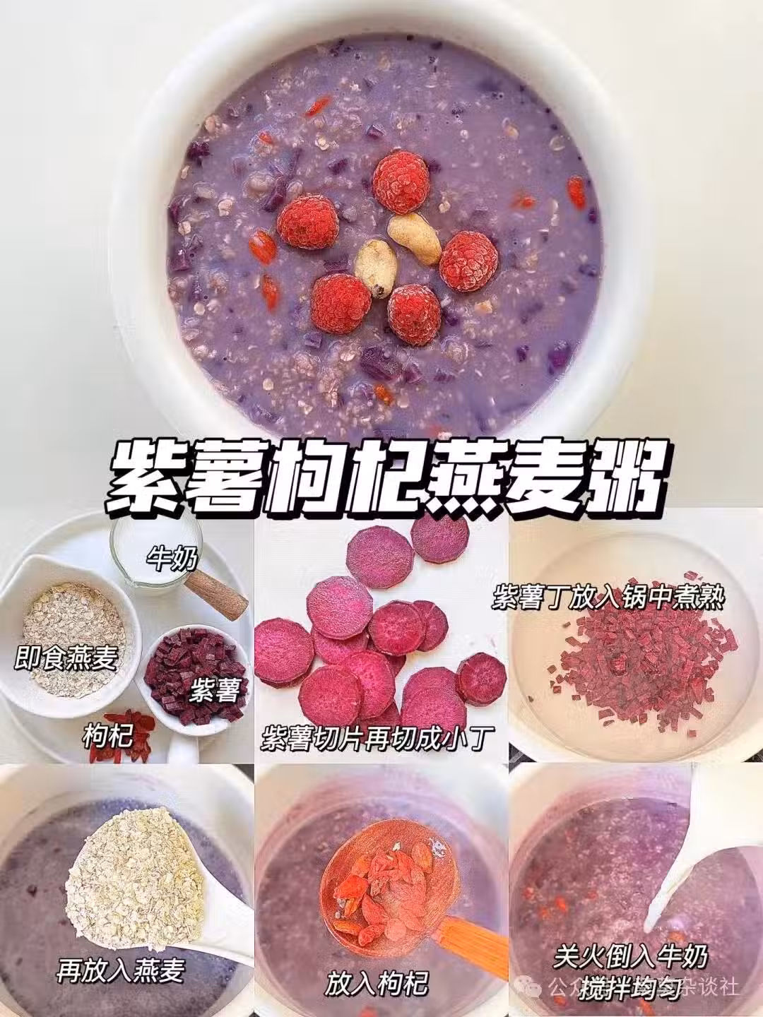 食材:燕麥片40g | 紫薯100g | 枸杞10粒 | 牛奶200ml