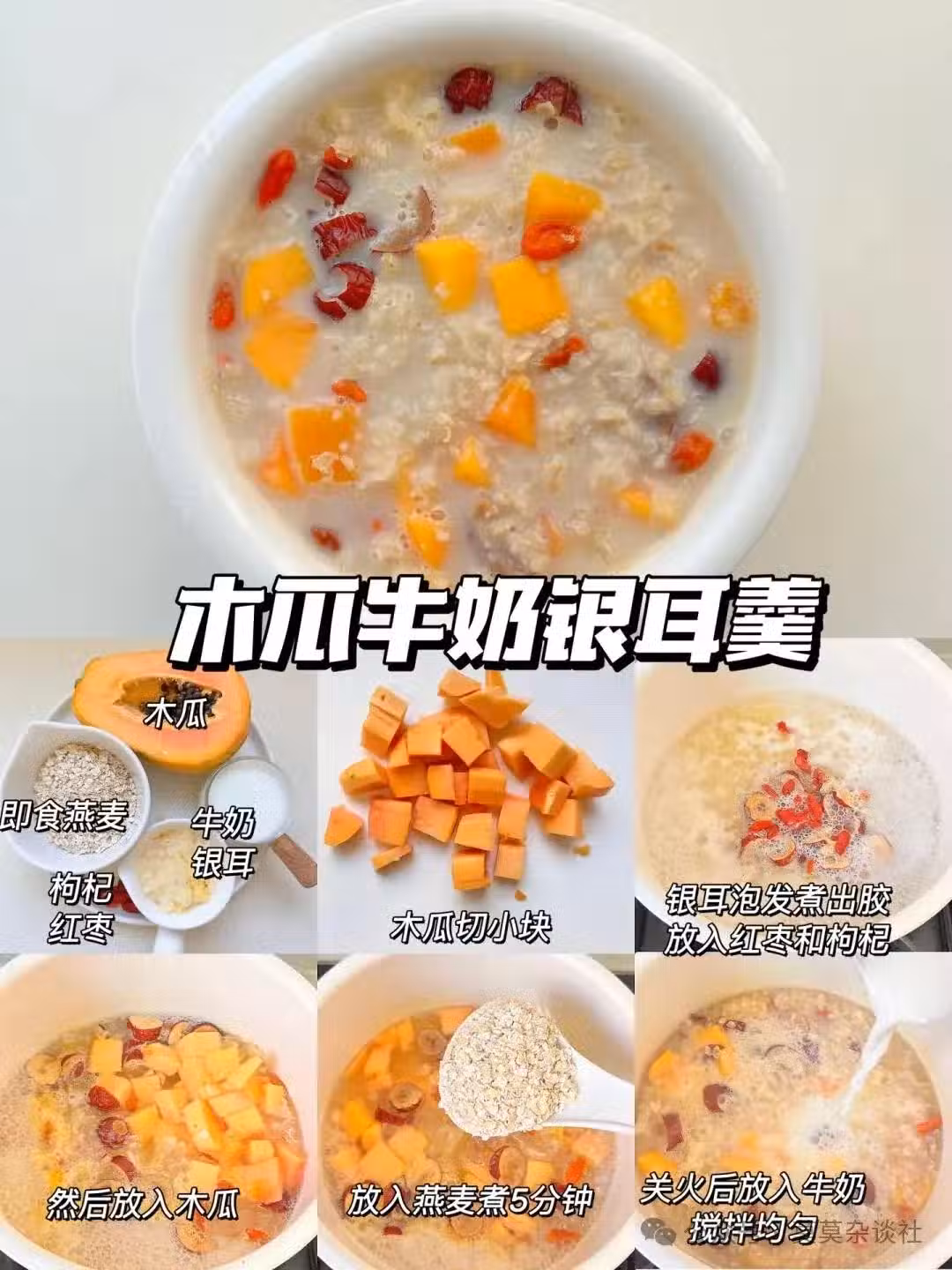 木瓜不僅顏值高,還被稱為「潤膚水果」,搭配牛奶和燕麥煮成粥,喝起來香甜絲滑,滿滿的幸福感。它能健脾消食、潤膚養顏,特別適合冬天腸胃不適或者皮膚乾燥的小夥伴。