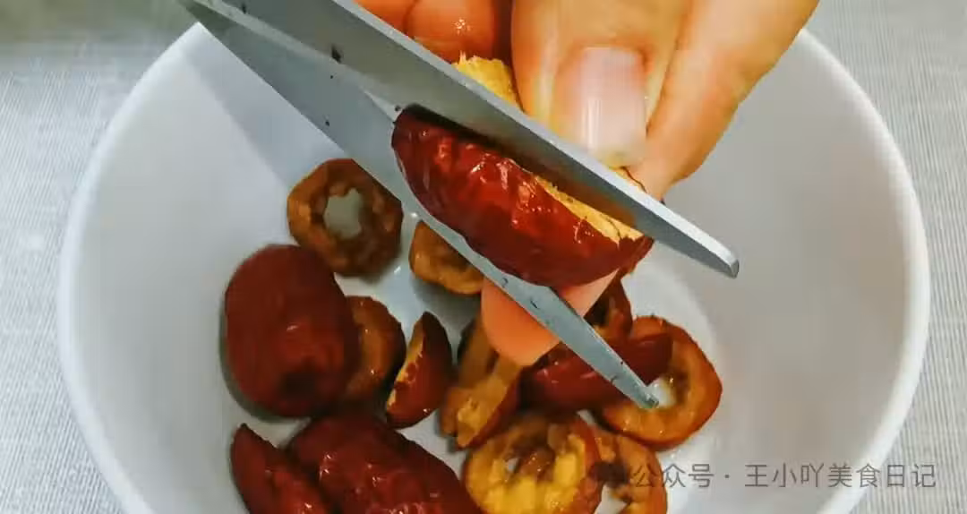 5、去紅棗核:雖然紅棗營養豐富,但紅棗核較為燥熱,容易引起上火,因此建議去除。可以用剪刀剪開紅棗,去除棗核,或者直接用手捏開。