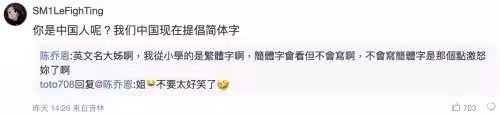▲中國網友嗆陳喬恩發文要用簡體字,她親自回應:「我從小學的是繁體字啊。」(圖/翻攝自陳喬恩微博)6666666666