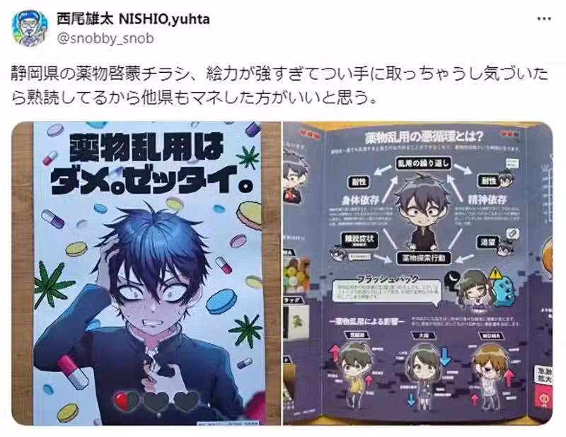 日本漫畫家西尾雄太,最近分享了自己去便利商店的時候,發現了一份由靜岡縣政府推出的一款藥物濫用宣導傳單。