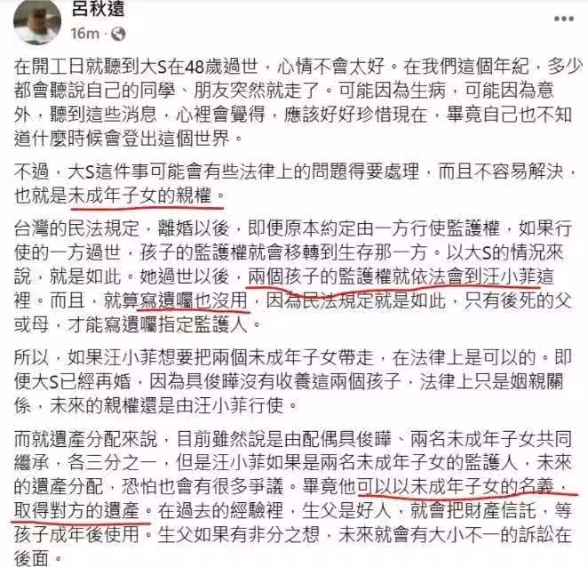 也就是說,無論徐家人怎麼不願意,大S去世後,孩子的監護權會自動轉到汪小菲手中。