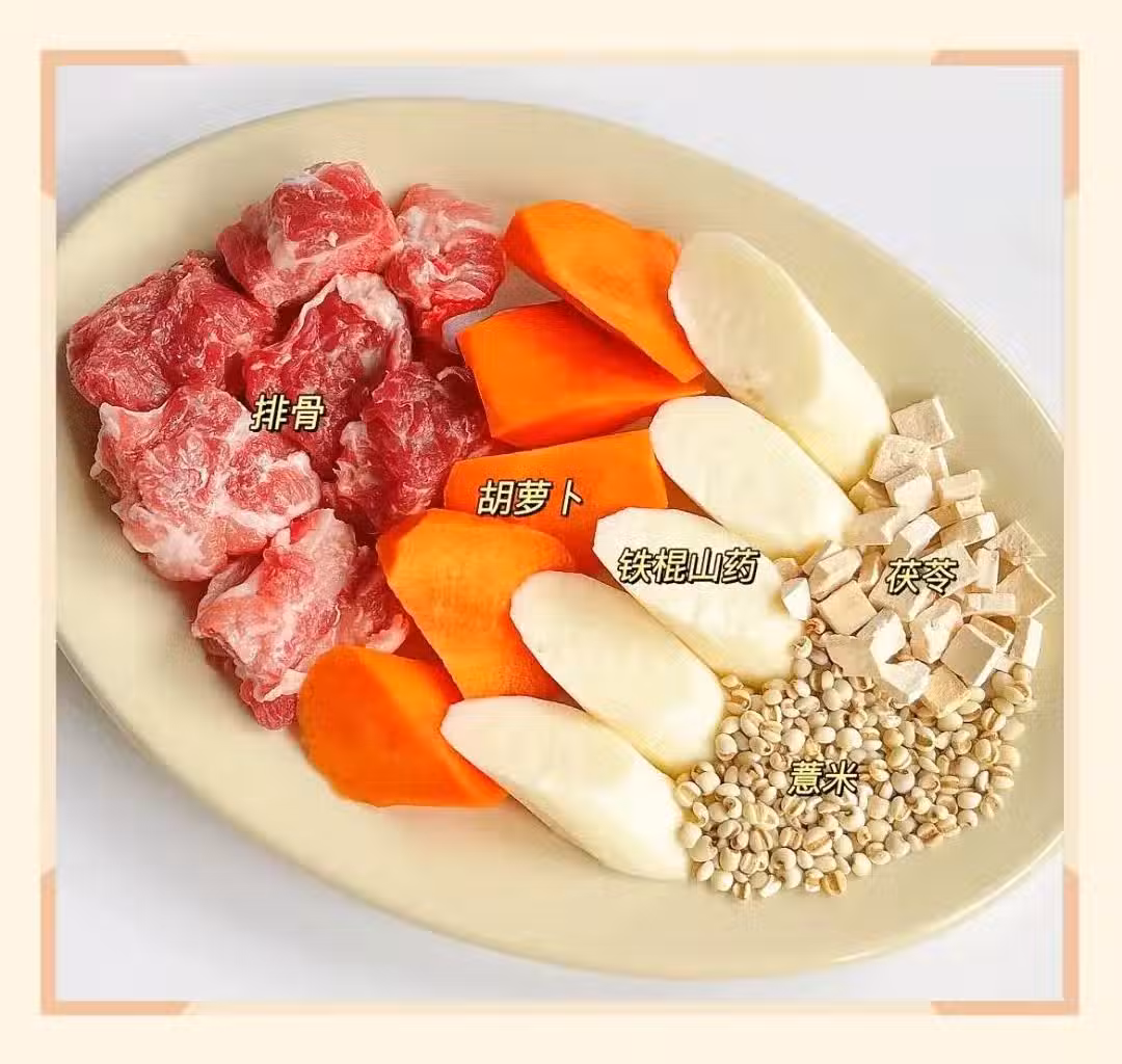 燉鍋中依次放入山藥、胡蘿蔔、排骨、茯苓、薏米,加清水沒過食材。