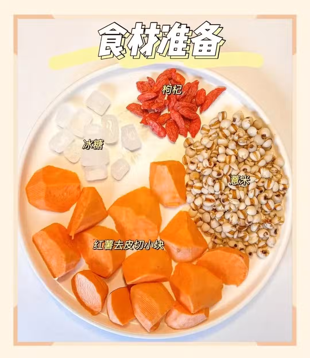 1. 提前一晚將薏米浸泡好,紅薯去皮後切成小塊,枸杞清洗乾淨備用。