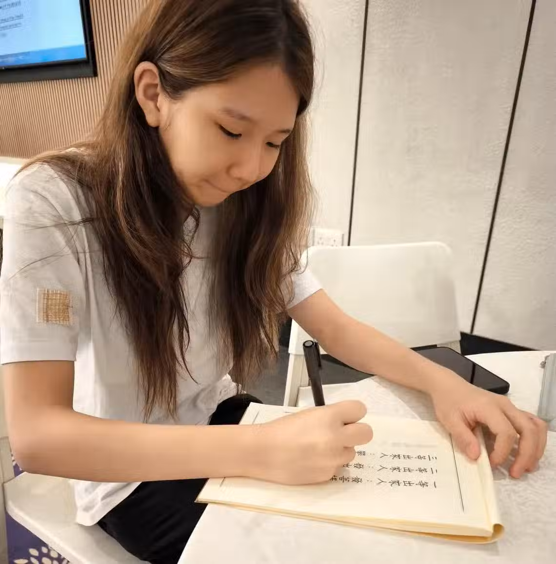 懂事的吳絢茹專心替媽媽抄完經文。(鍾雁齡攝)