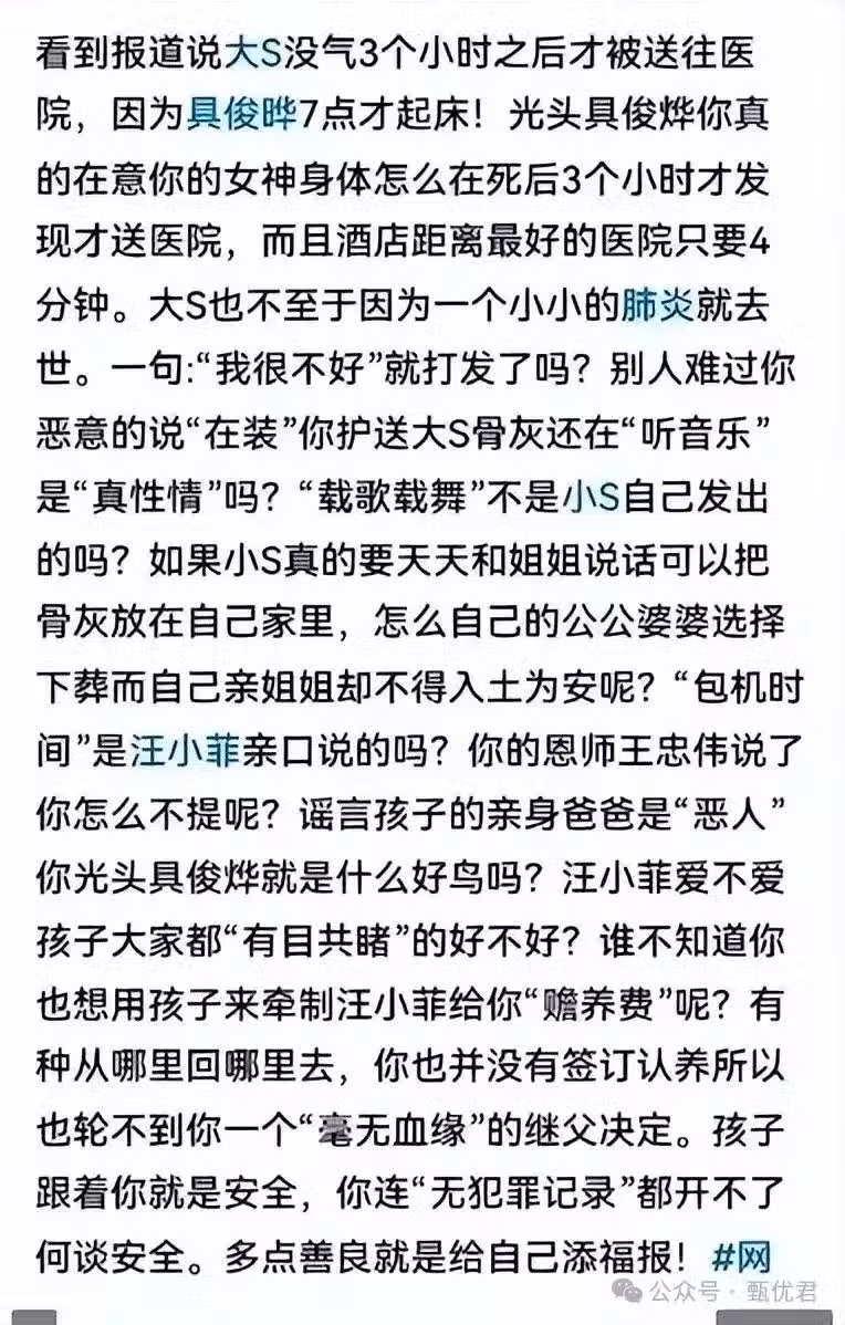 在大 S 送醫之初,徐家並未及時、準確地向公眾披露她的病情,導致外界只能通過各種小道消息來拼湊事實,這無疑為謠言的滋生提供了土壤。