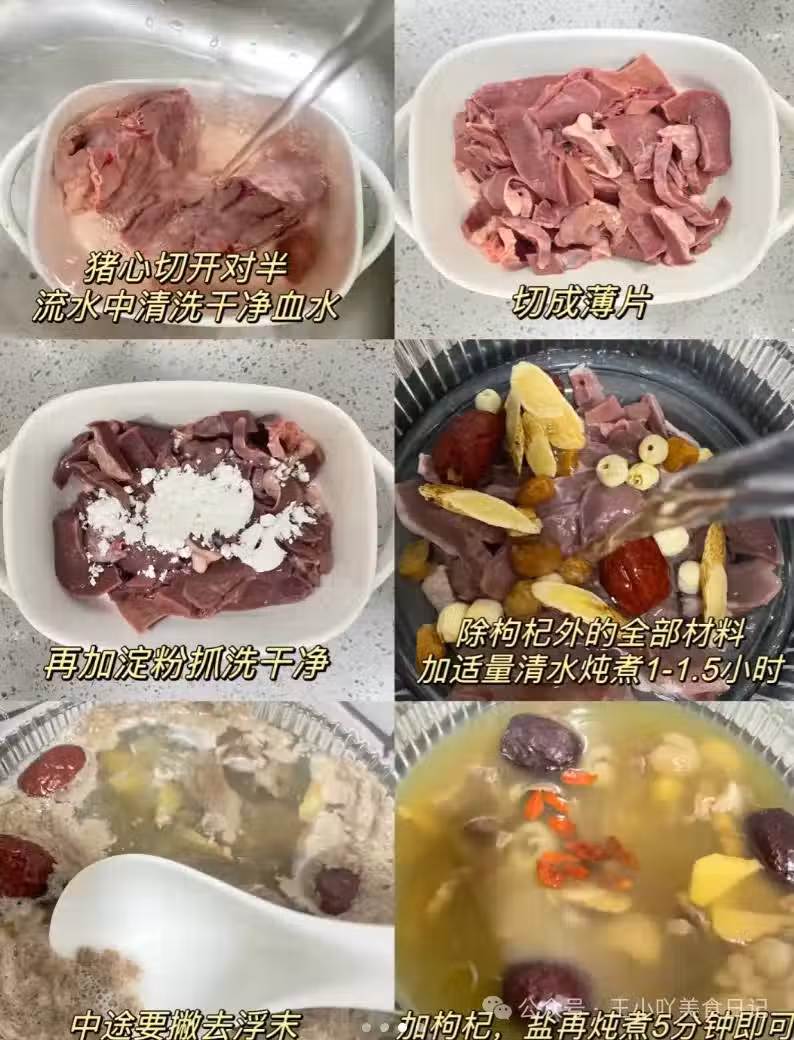 1、豬心預處理:首先將豬心切成對半,置於流動的清水中仔細清洗,儘可能地去除其中的血水。這一步驟至關重要,因為血水會影響湯的口感和純凈度。清洗完畢後,將豬心切成薄片,此時仍會有血水滲出。接著,加入適量的生粉,用手輕輕抓揉片刻,使生粉與血水充分混合,然後再次用清水沖洗乾淨。這樣處理後的豬心能夠減少腥味,使湯更加鮮美。 2、燉煮食材:將除枸杞之外的所有材料,包括處理好的豬心、蓮子、黃芪、紅棗、桂圓肉,一同放入燉鍋中。加入適量的清水,注意清水的量要適中,以確保燉煮過程中食材能夠充分吸收水分且湯汁不會過於稀薄或濃稠。然後開啟燉鍋,燉煮 1 - 1.5 個小時。在燉煮過程中,要保持小火慢燉,這樣可以使食材的營養成分充分釋放到湯中,使湯的味道更加濃郁醇厚。