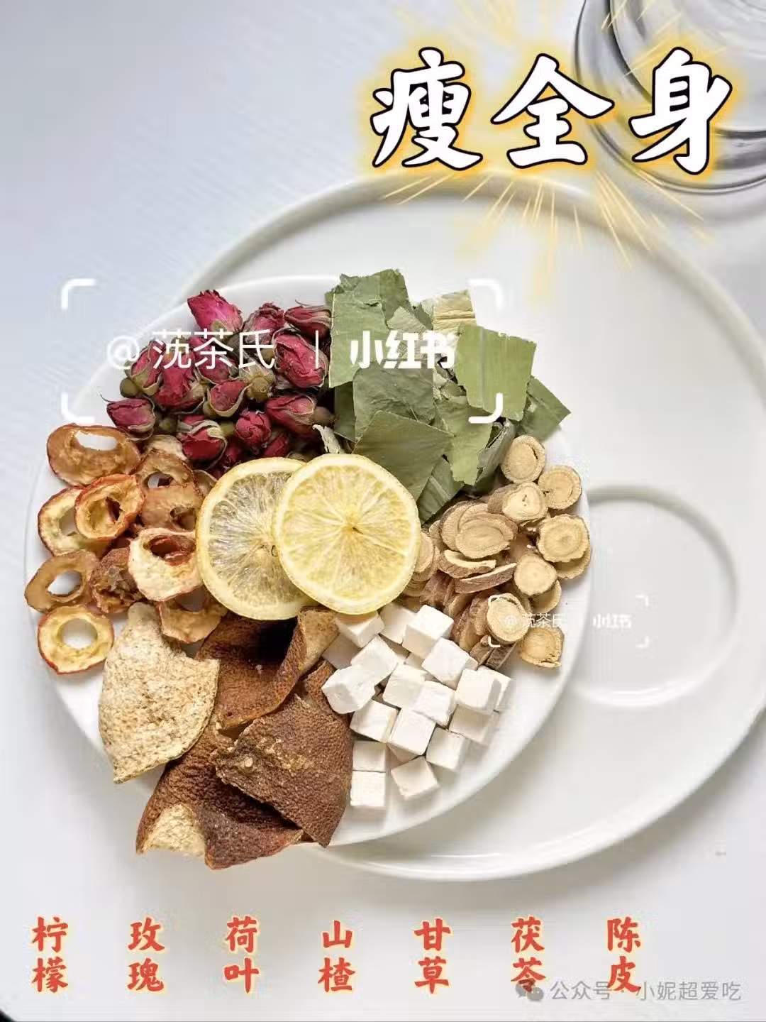 食材:陳皮、山楂、玫瑰、荷葉、甘草、茯苓、檸檬。身上有水腫、虛胖困擾的寶子,喝喝看,也許會對體重有積極影響。