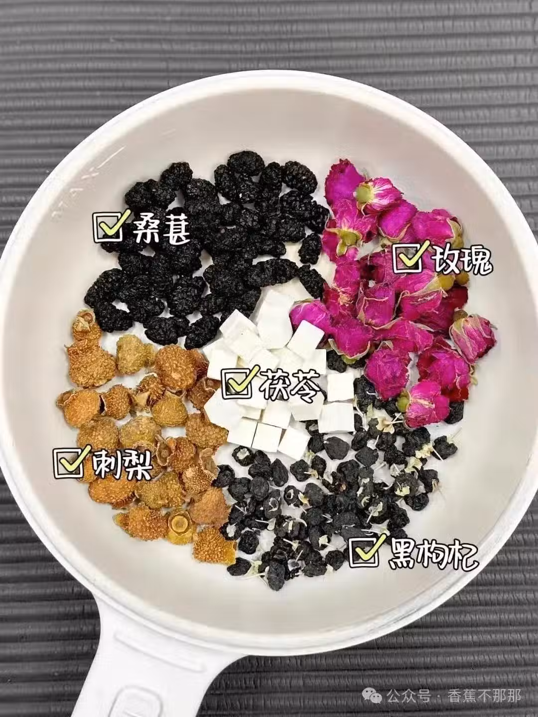 黑枸杞、桑甚6顆、玫瑰3朵、刺梨3顆、茯苓5顆。