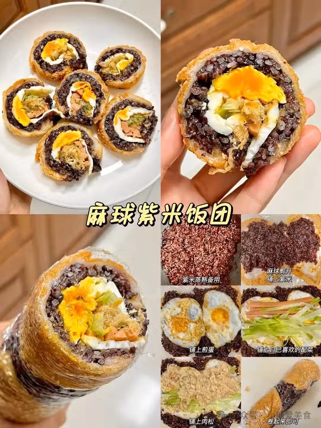 紫米包肉鬆鹹蛋黃,外層滾滿芝麻油炸。外脆里糯還能拉絲,一口下去靈魂都顫了顫——就是熱量炸彈炸得我錢包比體重先縮水。嗚嗚嗚~