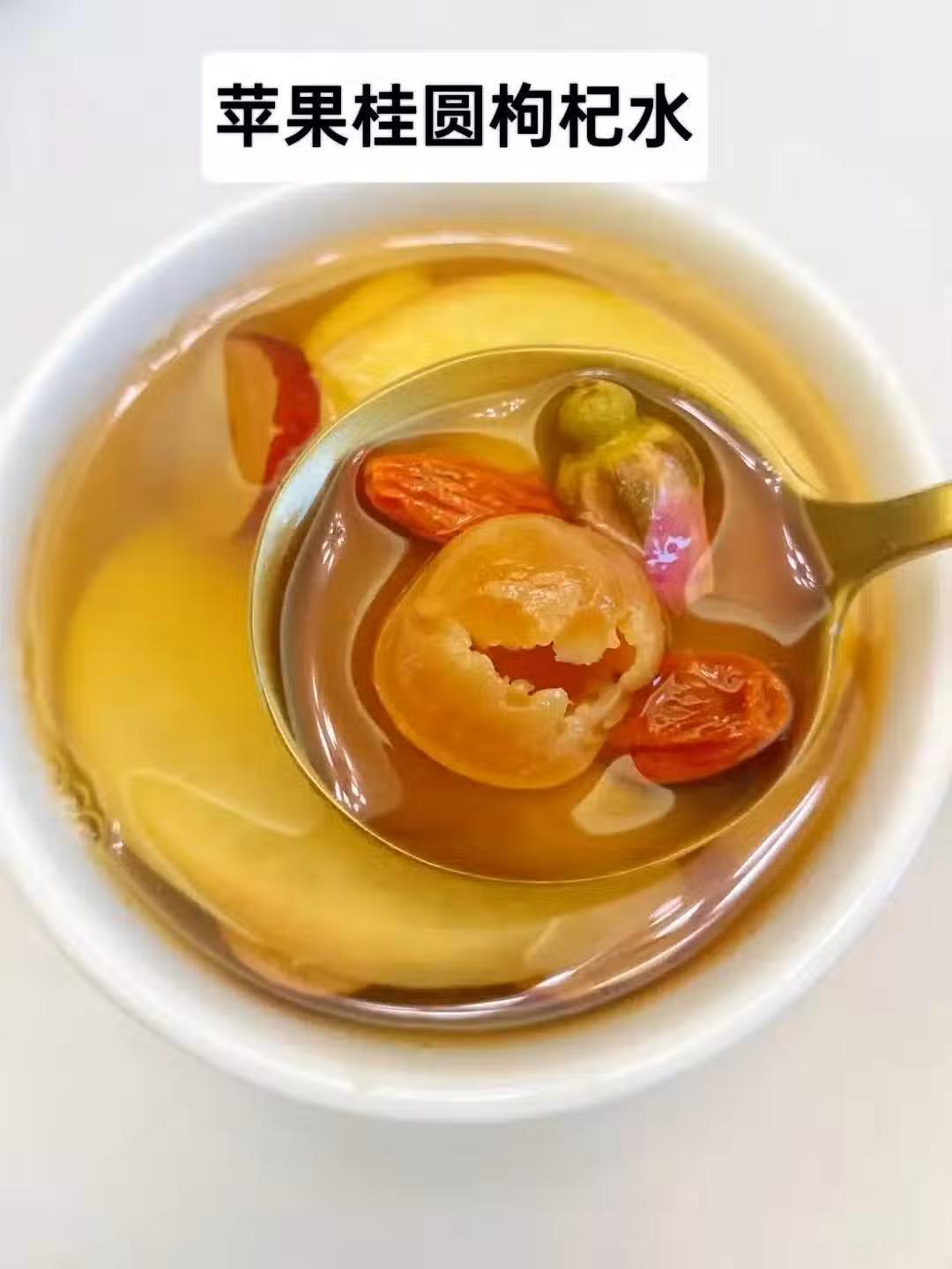 蘋果切片,與其他食材一起加水煮15分鐘,最後放入枸杞、玫瑰一起燜泡5分鐘即可。