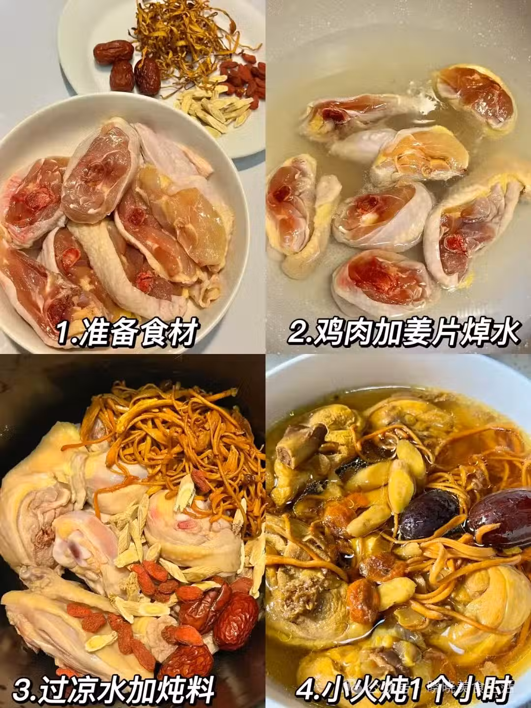 食材 :半隻雞 兩個香菇 一把蟲草花(也可以不放或者放山藥)紅棗四五顆 薑片三四片 蔥 做法:1、將雞塊仔細清洗乾淨,然後放入冷水中,加入兩勺料酒、適量的蔥段和薑片進行焯水處理。焯水的目的是為了去除雞塊中的血水和雜質,同時也能去腥增香。待雞塊變色後,撈出瀝干水分備用。