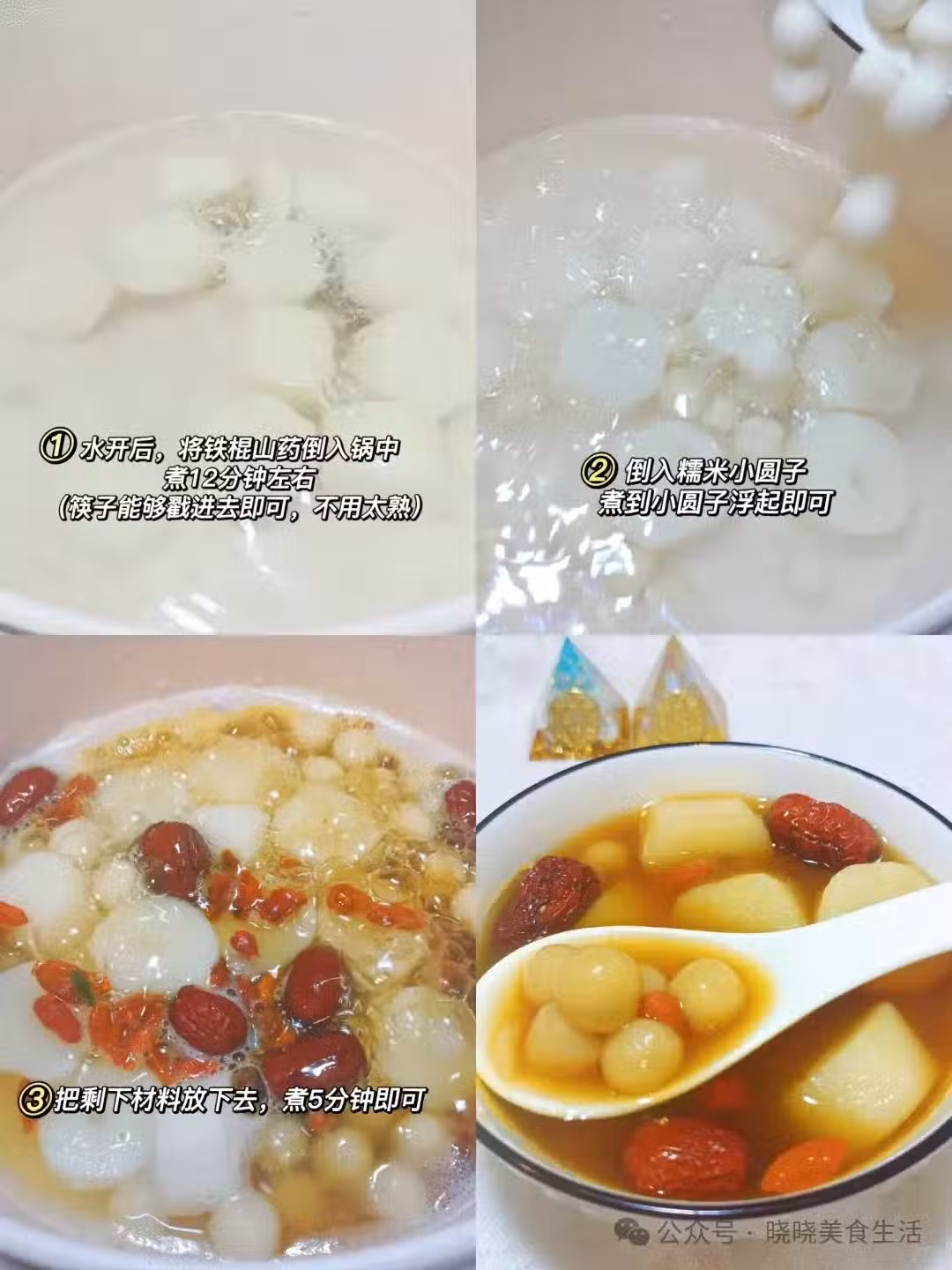 食材準備: 鐵棍山藥、紅棗、枸杞、紅糖、糯米小圓子 👉🏻製作步驟: 1.開水下鍋煮山藥,煮12分鐘左右 2.放入糯米小圓子,煮到小圓子浮起即可 3.將枸杞,紅棗,紅糖放入鍋中,煮5分鐘左右 (希望紅棗更入味的姐妹可以在第2個步驟放入 紅棗) 4.可以出鍋啦~