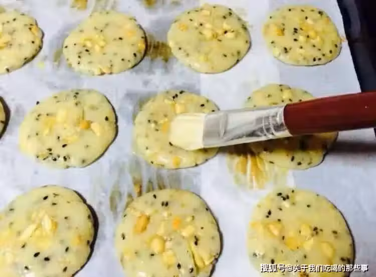 4、做好的花生餅放在烤盤上,表面刷上蛋黃液。烤箱180℃提前預熱10分鐘,放入花生餅烤20分鐘,顏色金黃就可以出鍋了,吃起來香酥可口,營養美味。