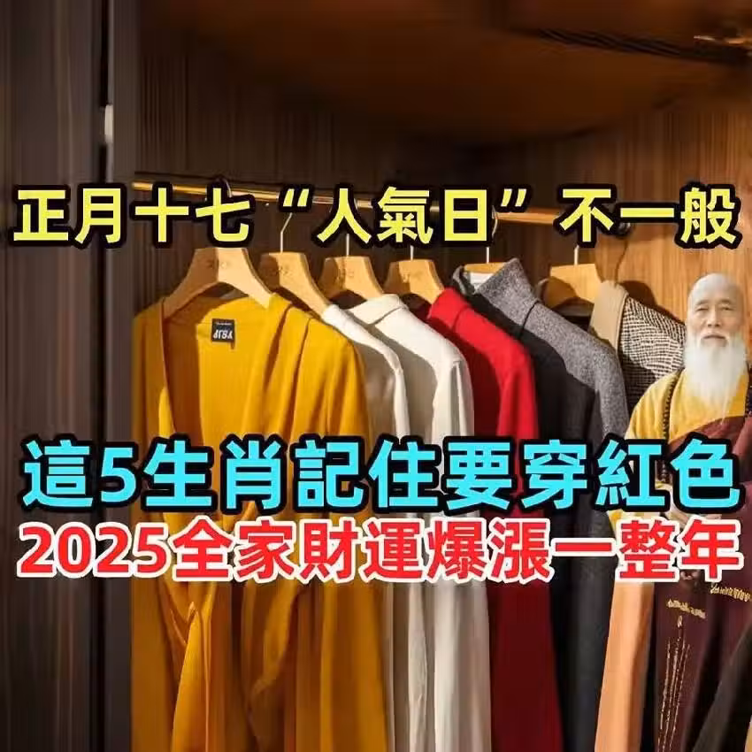 2025年,這5大生肖在正月十七一定要穿紅色! 不管是一件紅衣、紅圍巾、紅襪子,甚至是一條紅色腰帶,都能夠讓你的財運、人緣、事業運全面提升!趕快轉發給身邊的親朋好友,讓大家一起財運大爆發,2025年旺旺旺!🎉💰🔥