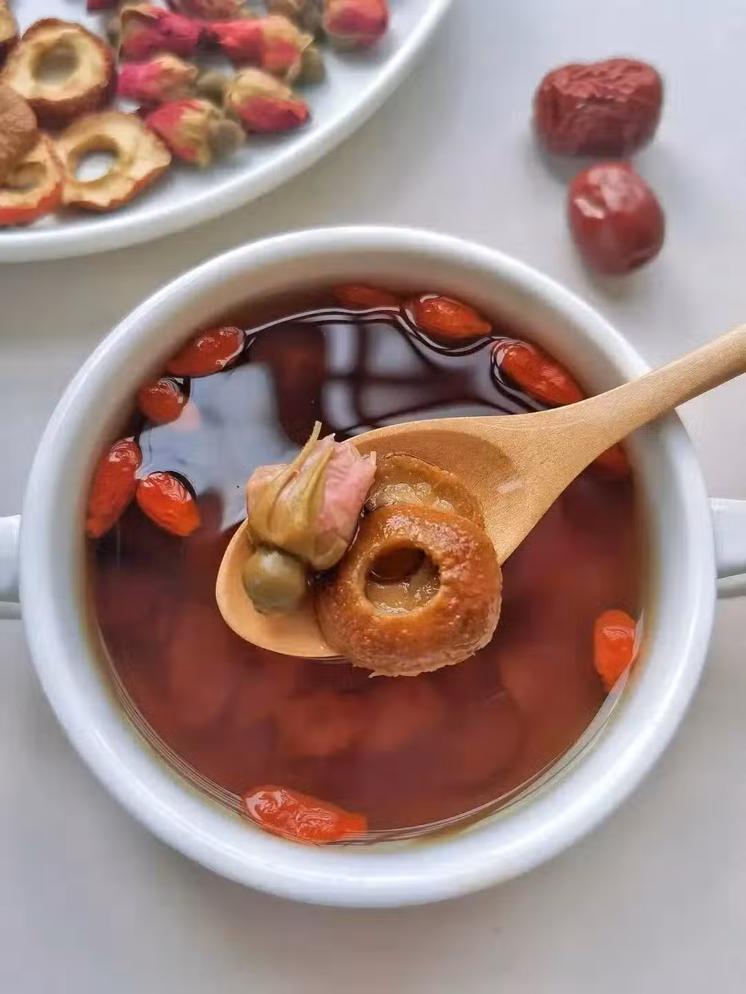【食材】玫瑰花6朵,山楂5個,紅棗適量,枸杞適量,紅糖一塊