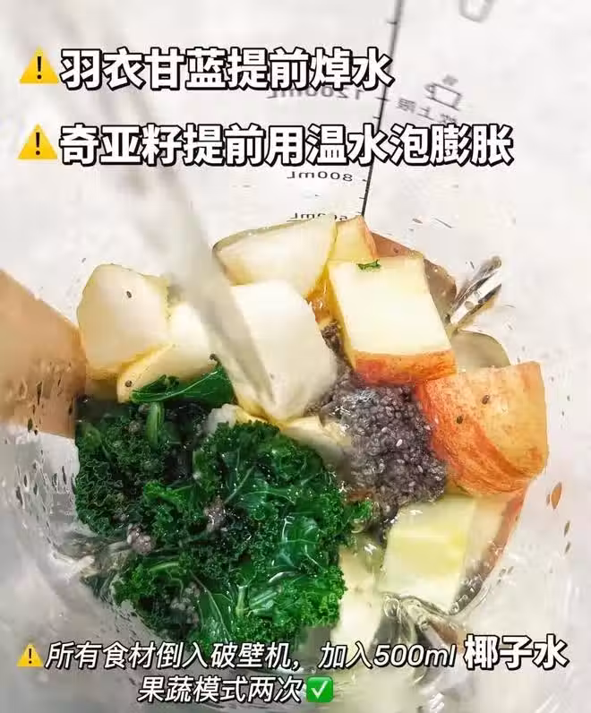 這裡面的每一種食材都大有講究呢!羽衣甘藍可是蔬菜界的「營養擔當」,富含多種維生素、礦物質,還有大量的膳食纖維,能促進腸道蠕動,幫助我們排出體內的毒素。牛油果雖然脂肪含量高,但都是健康的不飽和脂肪酸,能增加飽腹感,減少其他高熱量食物的攝入。蘋果和梨就不用說了,富含果膠,能吸附腸道內的油脂,還能補充水分和維生素。奇亞籽更是厲害,它富含膳食纖維、蛋白質和Omega-3脂肪酸,既能吸水膨脹,讓你有滿滿的飽腹感,又能調節身體的代謝。椰子水含有豐富的電解質,能為身體補充水分和能量,還能加快新陳代謝。